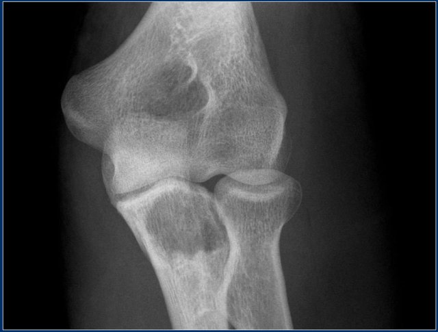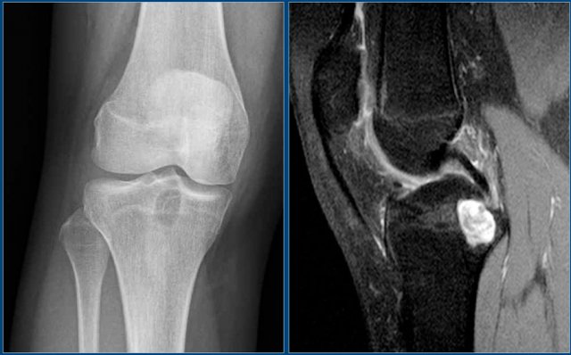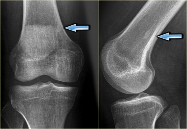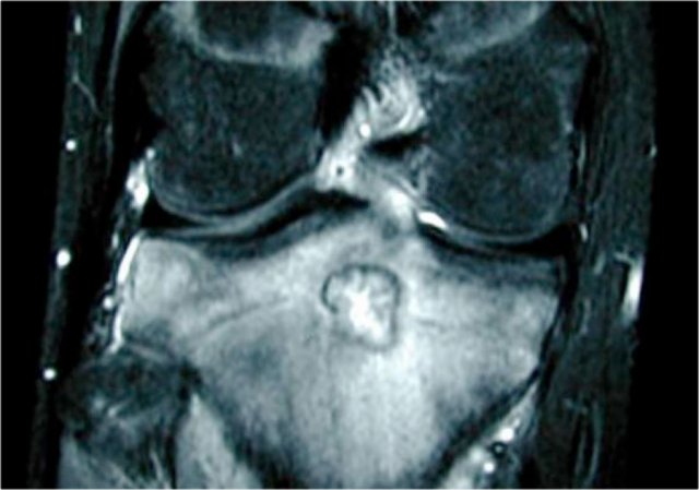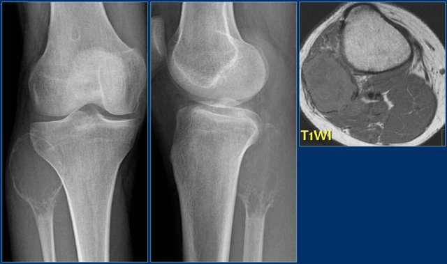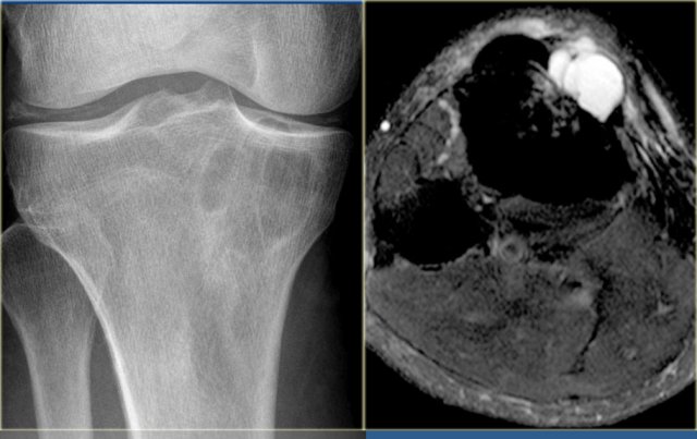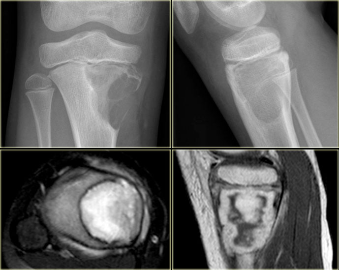 Here a well-defined lucent lesion in the epiphysis of the proximal tibia in a young patient.