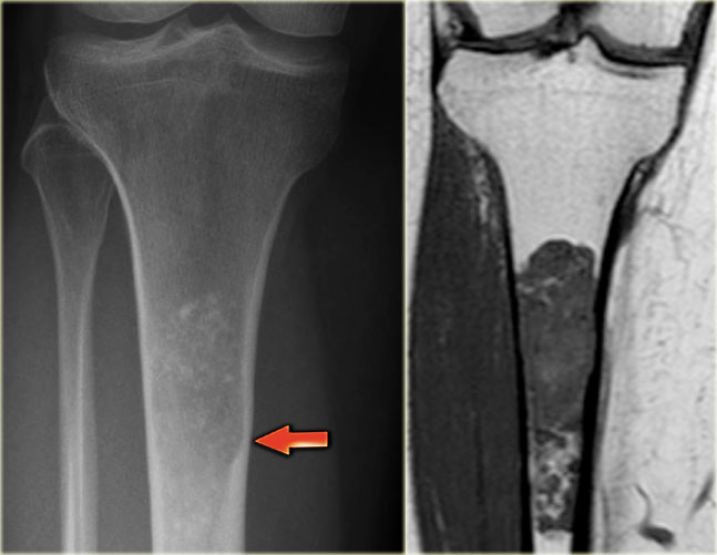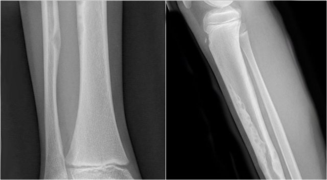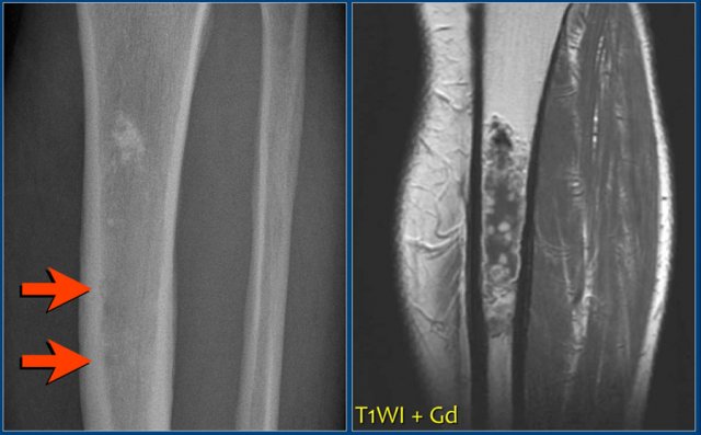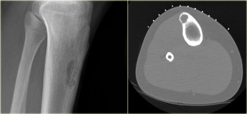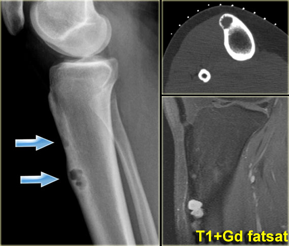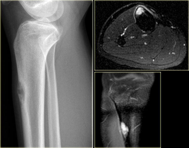 On the left two different patients with an intracortical or subperosteal osteolytic well-defined lesion in the tibia.