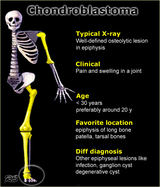 - Chondroblastoma is also located in the epiphysis, but is seen exclusively in the epiphysis without extention to the metaphysis and is seen in a younger age group.