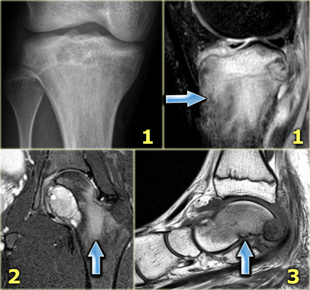 Notice that most of these lesions are well-defined and located in the epiphysis and extend into the metaphysis.