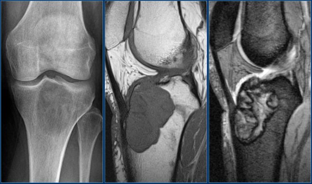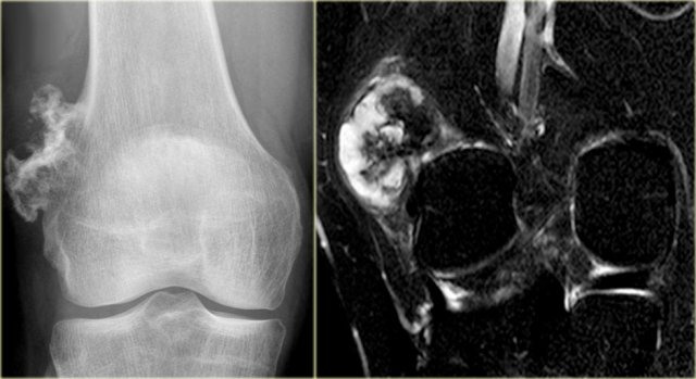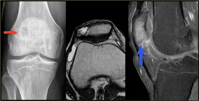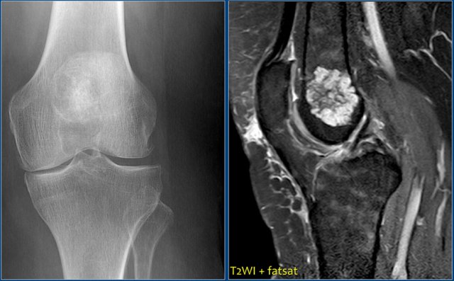 On the left a giant cell tumor presenting as an eccentric lytic lesion in the medial epi- and metaphysis of the distal femur.