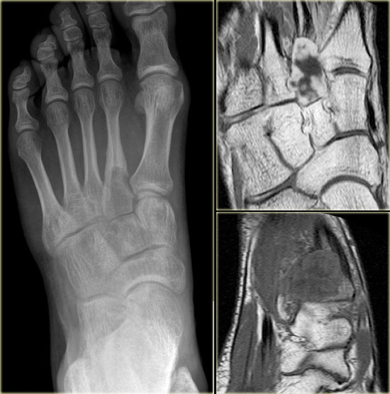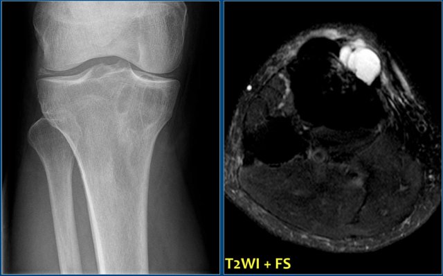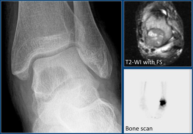 On the left an expansile well-defined osteolytic lesion with a sclerotic margin in the talus.