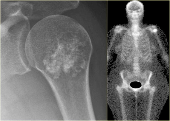 The radiograph on the left shows a mixed lytic-sclerotic lesion of the left iliac bone.