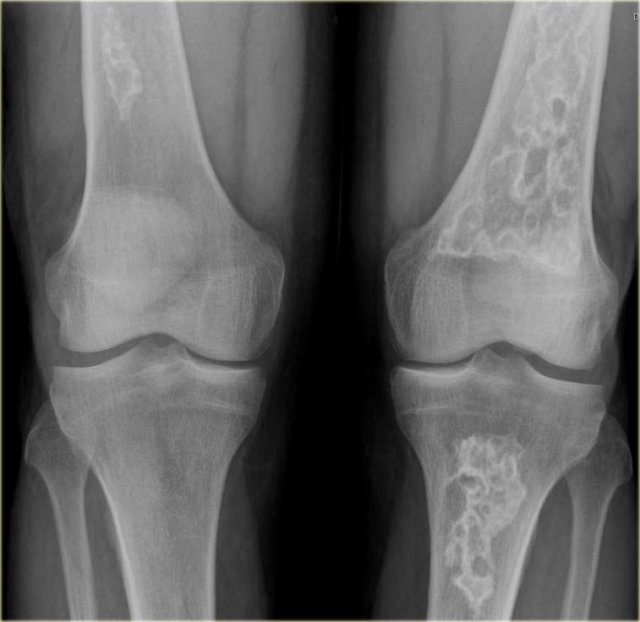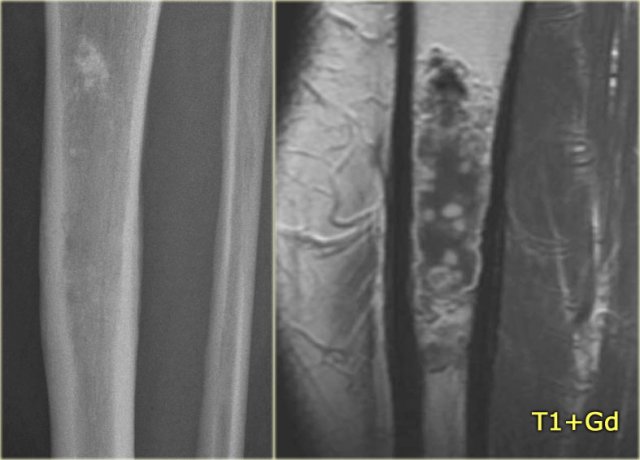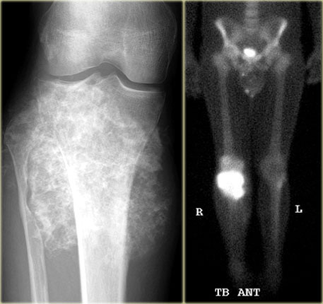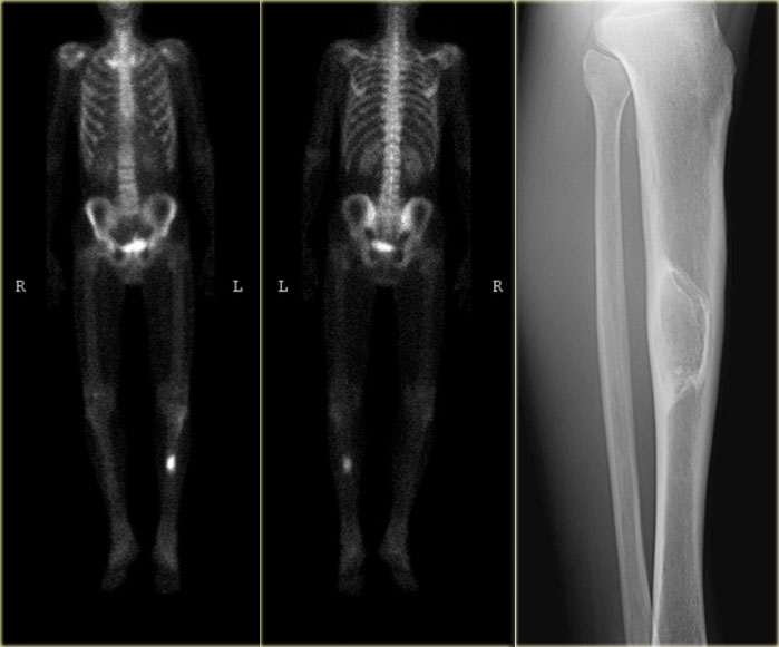 Bone scintigram in 40-year old patient in the tibia shaft.