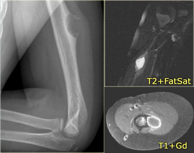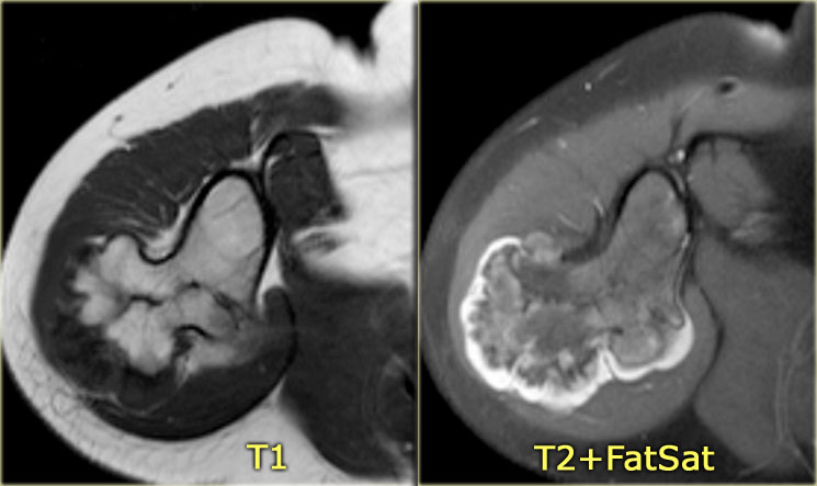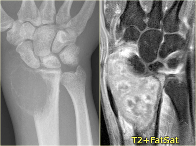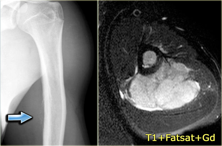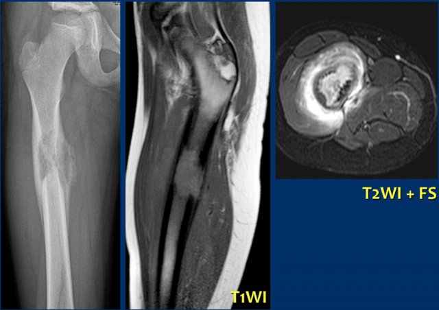 MRI is pivotal for demonstrating the intramedullary and soft tissue extension.