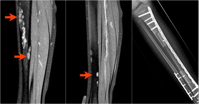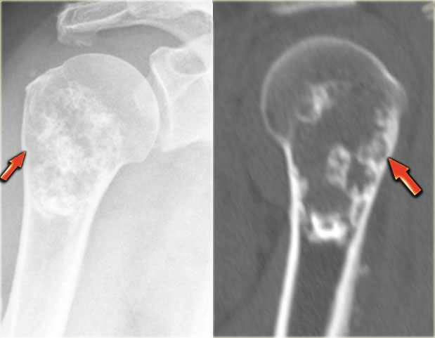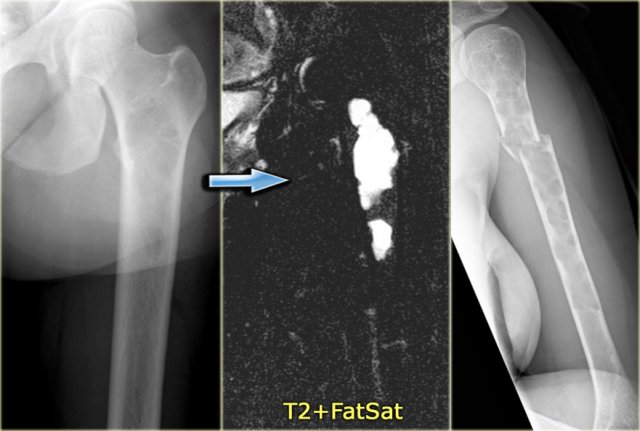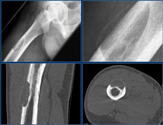 - Plain radiographs and CT show cortical lucencies combined with sclerosis.