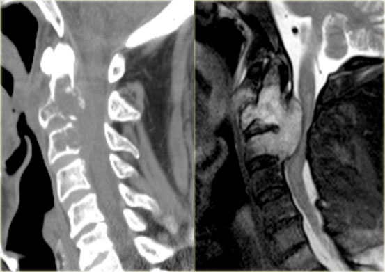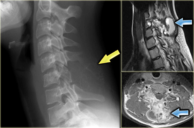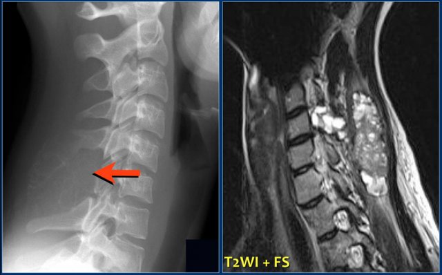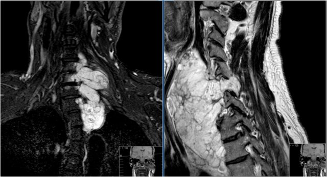 Here an ill-defined expansile lesion with very subtle peripheral bone shell arising from the spinous processes C5 and 6.
