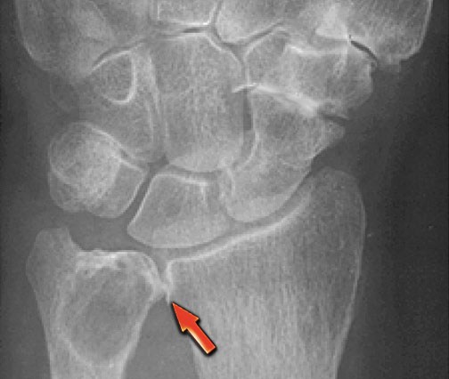 Some extend onto the articular surface (yellow arrow and small red arrows).