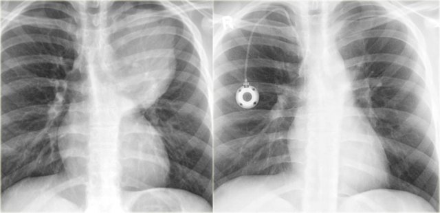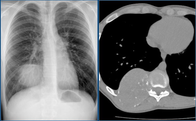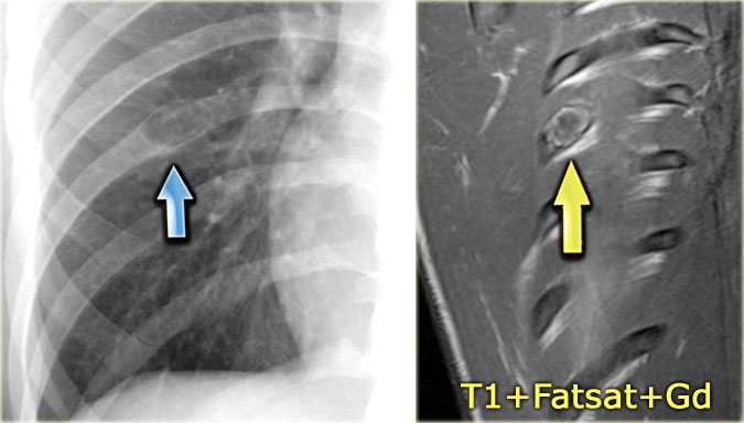 On the left images of a patient with fibrous dysplasia of the rib with remarkable expansion.