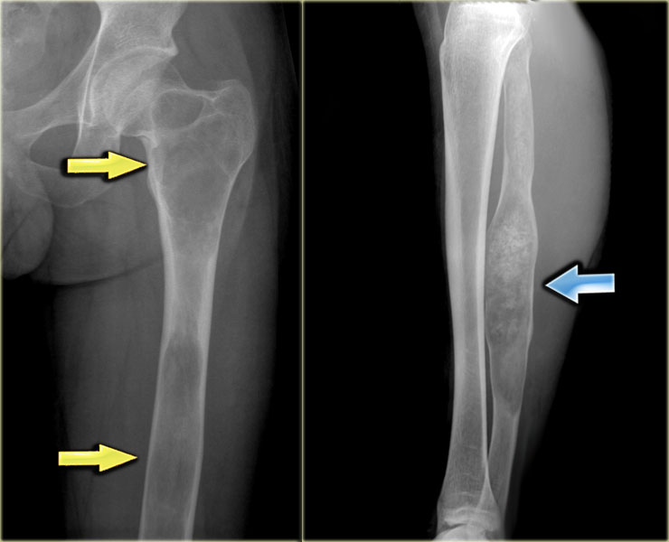 On the left images of a patient with polyostotic fibrous dysplasia, with lucent lesions in the proximal and mid-diaphyseal femur, and lesion with groundglass density and calcifications in the fibula.