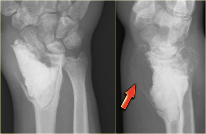 There is diffuse heterogeneous enhancement, and extension to the radiocarpal joint and surrounding edema in bone and soft tissues.