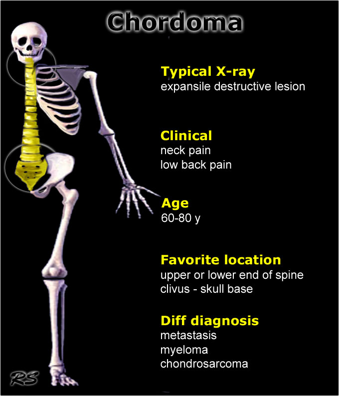Differential diagnosis in a patient of 50 years of age: metastasis, plasmacytoma, chordoma, chondrosarcoma (no calcifications present), giant cell tumor.