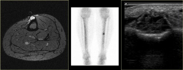 Here the MR, bone scan and the sonogram of the same patient with ABC.