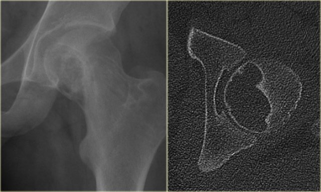 The radiograph on the left shows a mixed lytic-sclerotic lesion of the left iliac bone.