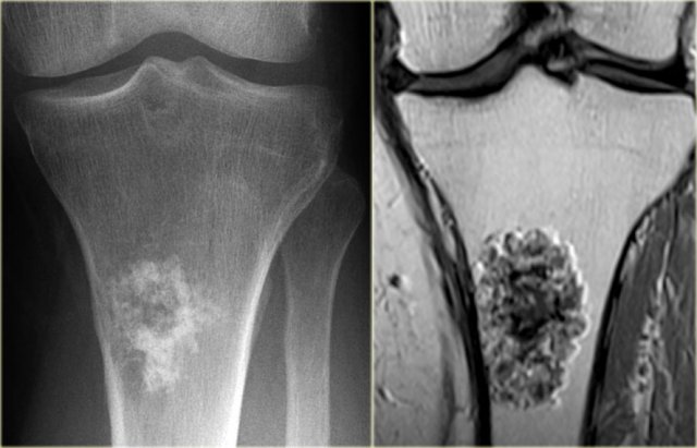 ABC versus Adamantinoma. Notice resemblance between intracortical ABC in tibia (left) and Adamantinoma (right).