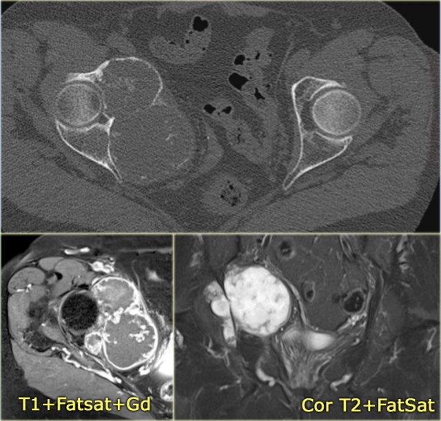 The radiograph on the left shows a mixed lytic-sclerotic lesion of the left iliac bone.