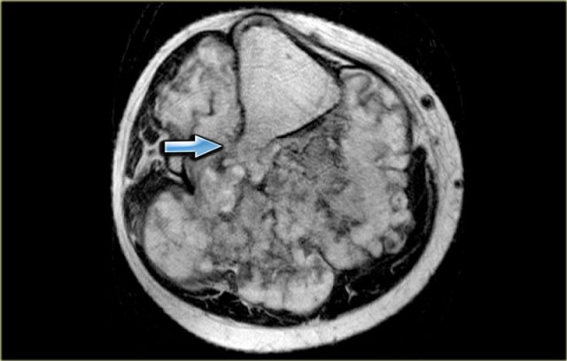 The sagittal T2-weighted MR-image with FS demonstrates multiple small cavities within the tumor, due to secondary ABC.