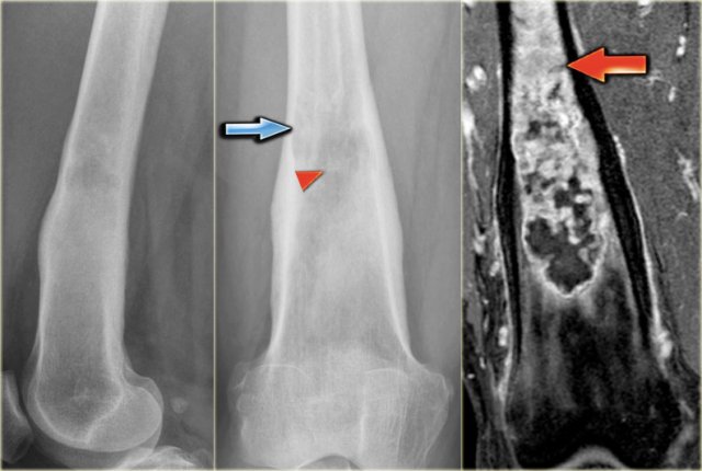 The radiograph on the left shows a mixed lytic-sclerotic lesion of the left iliac bone.