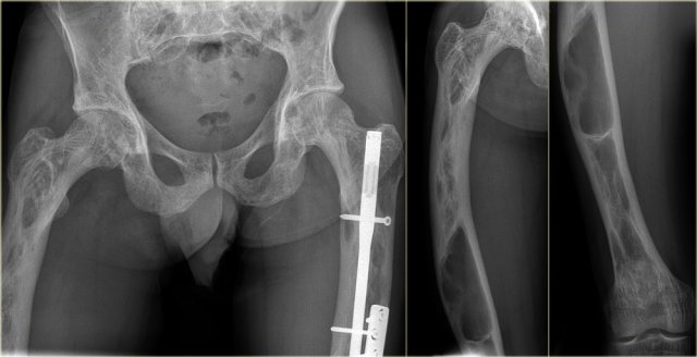 On the far left a well-defined lytic lesion with groundglass appearance in the proximal femur diaphysis, consistent with fibrous dysplasia.