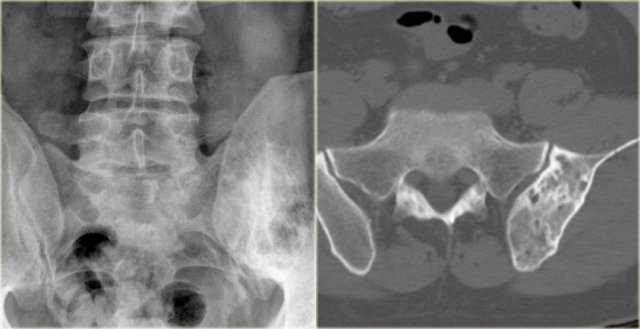 The radiograph on the left shows a mixed lytic-sclerotic lesion of the left iliac bone.