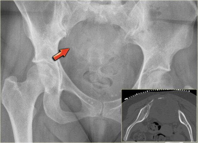 The radiograph on the left shows a mixed lytic-sclerotic lesion of the left iliac bone.