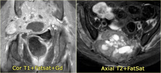 On the sagittal T2WI with FS multiple small cavities are seen within the tumor, due to secondary ABC.