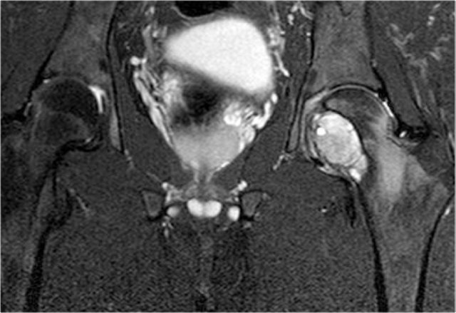 In this patient there are identical lesions within the proximal femur and left acetabulum.