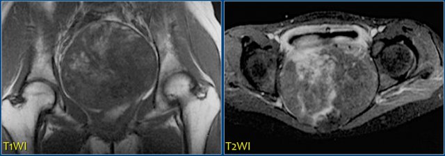 The radiograph on the left shows a mixed lytic-sclerotic lesion of the left iliac bone.