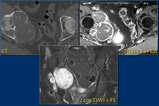 Axial CT image on the right shows some broadening of the iliac bone with a ground glass appearance and no cortical destruction.