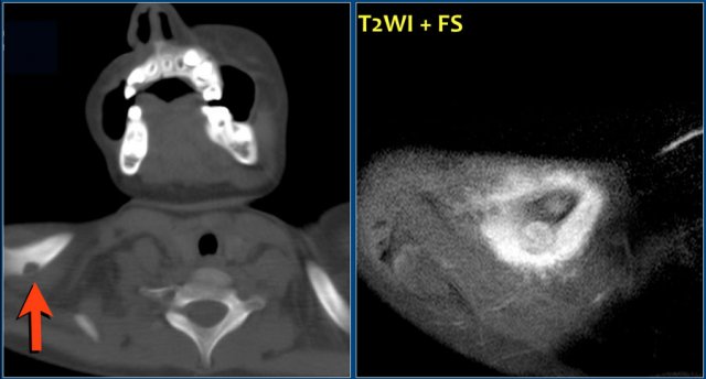 The T2-weighted MR-image shows the fluid content and on the T1-weighted image there is a subtle fluid-fluid level.