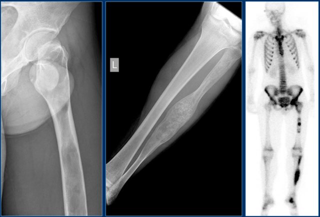 Notice multifocal areas of high uptake on bone scintigraphy: acetabulum, femur diaphysis, tibia and ankle.