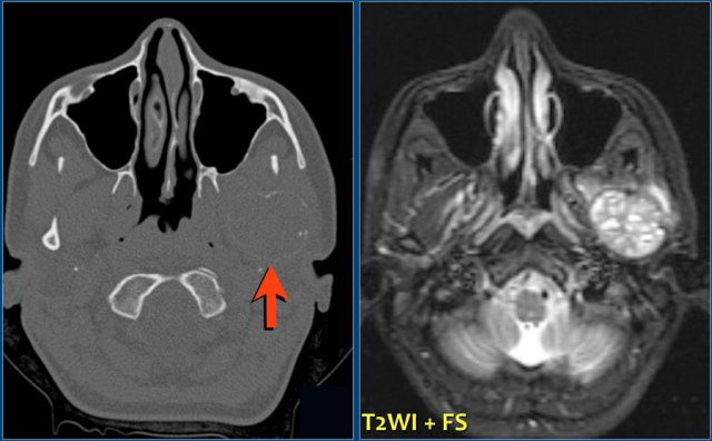 - On MRI, the lesion is lobulated with high signal intensity on T2-weighted images and strong enhancement after Gd-DTPA.