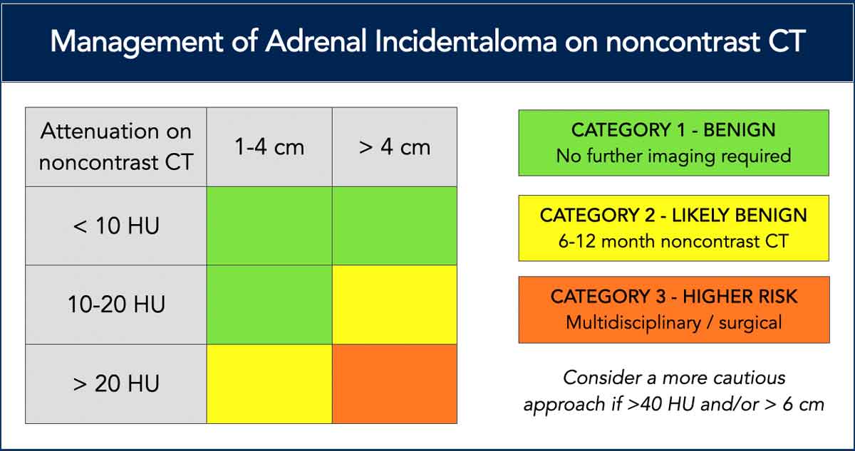 - Raising the benignity threshold to ≤20 HU for lesions <4 cm on noncontrast CT.