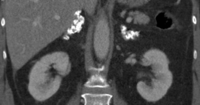Subsequent non-enhanced CT, performed several days later, demonstrated densities <10 HU in both adrenal glands, confirming the diagnosis of lipid-rich adenomas.