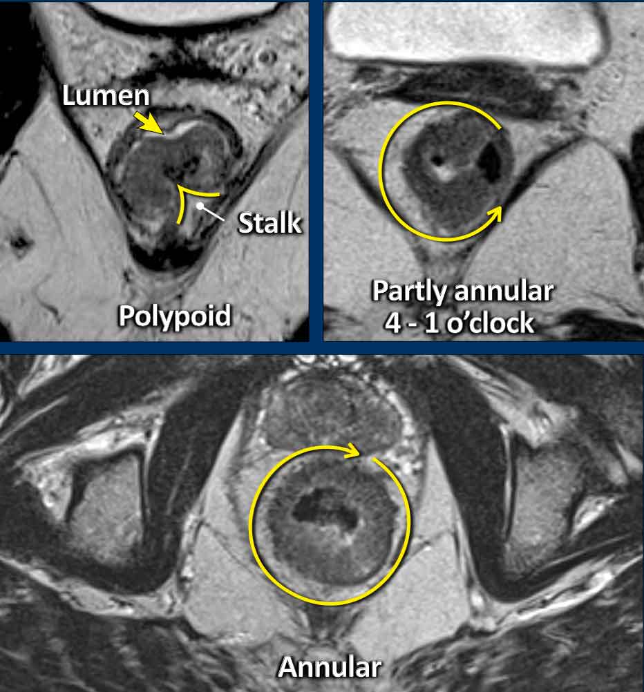 Invasive Margin: The tumor’s attachment site to the rectal wall—the invasive margin—is the site where the tumor may invade beyond the rectal wall, and is therefore critical for T-staging and assessing extramural extension.