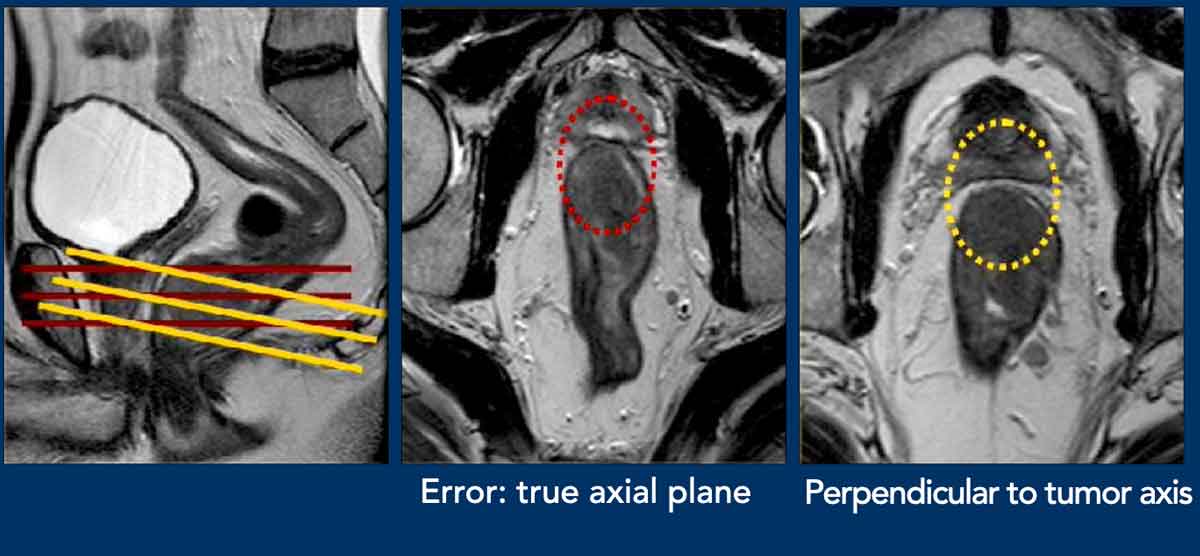 - Error: Axial view angled in the true axial plane, not perpendicular to the tumor axis of this distal rectal tumor.