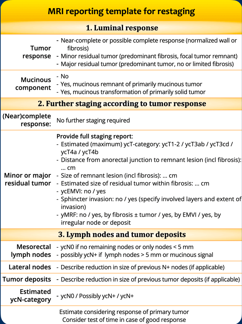 - A stepwise approach for restaging to guide the choice between surgery and organ-preservation.