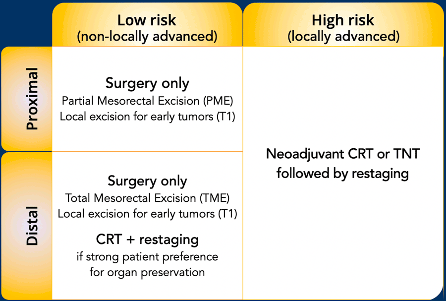- Management: Typically surgery alone; neoadjuvant treatment generally not required (unless organ preservation is the goal). Early stage T1 tumors may be eligible for local excision, following endoscopic/endorectal ultrasound confirmation.