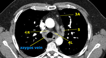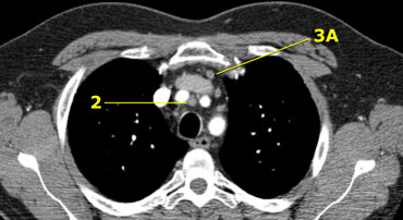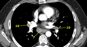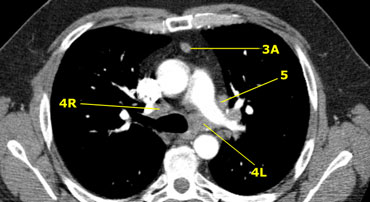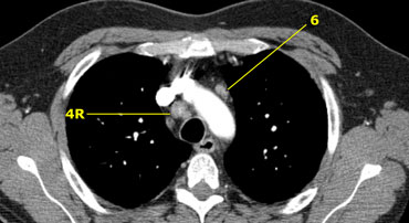 Notice also lower paratracheal nodes on the right, i.e. 4R nodes.